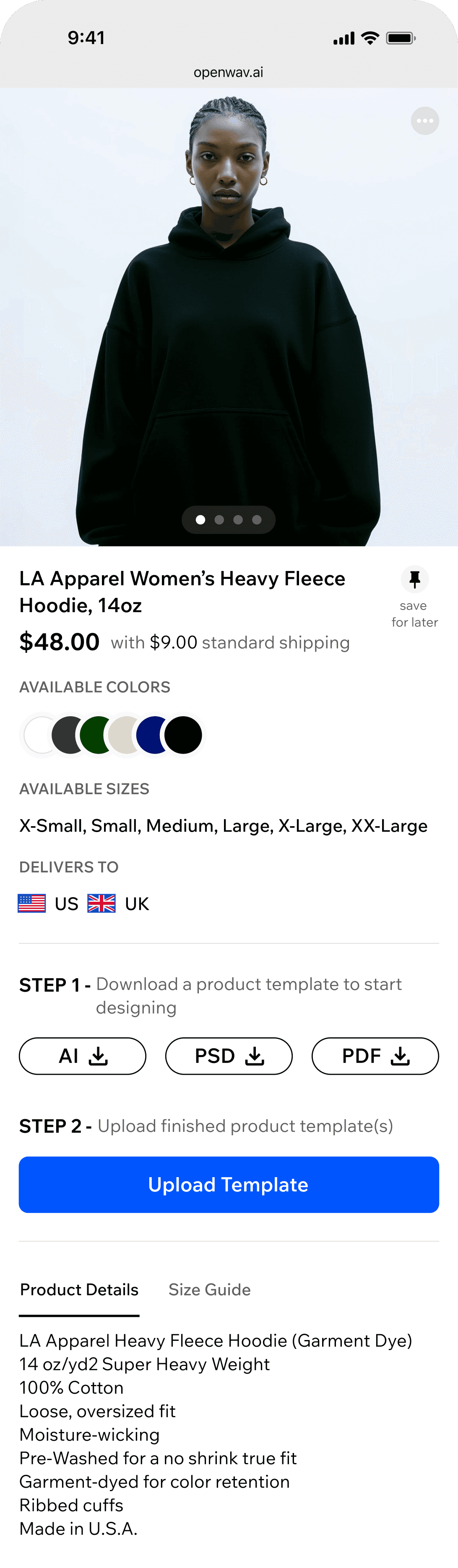 Download templates, apply your designs using your preferred editing tool, and upload the finished files.